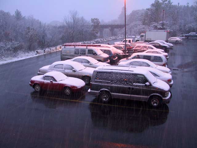 ↑ ↓ Weather forecasters are often wrong. But they got it right yesterday with the forecast of snow. I awoke in the middle of the night and looked out the motel window to see it falling on the parking lot to lightly cover the cars. And when I awoke it was still coming down. But all was not lost. Because the ground temperature was not below freezing the snow there was merely slush despite the 4-inches on the Miata and as long as the ground didn't get much colder...