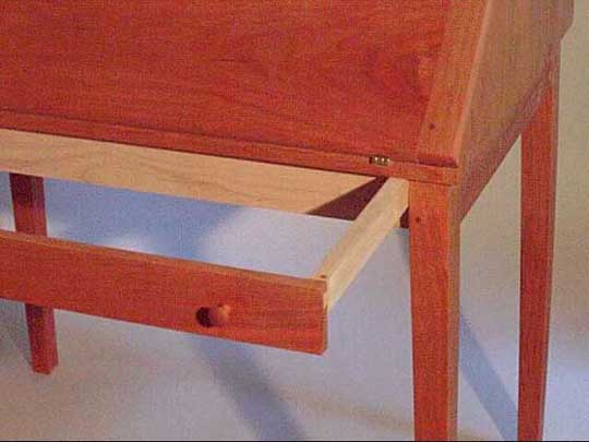 The sliders and hidden front apron are made of hard maple for rigidity and easy sliding. The carcase and drop was made of the previously mentioned three cherry boards and the legs are from thicker stock left over from my bed. The carcase measures 36 X 24 X 16 inches and the drop front measures about 16-inches deep. The hinges on the drop are supposed to be self-supporting but being an inherently suspicious kinda' guy I provided a slide-out support which is tied together by a false apron. Joinery in the carcase is all by half-blind dovetail joints and the apron-to-leg joints are pegged mortise-and-tenon joints.